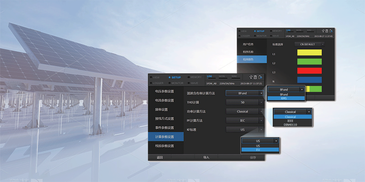 50Hz/60Hz電網工頻系統測量,中英語言設置,自定義多國家相序顏色標準和計算方法,滿足不同用戶需求。