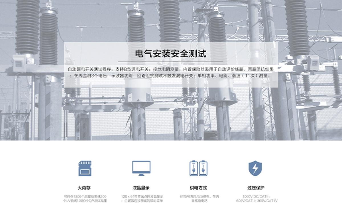 絕緣電阻;PE導(dǎo)線連續(xù)性;線路阻抗;回路阻抗(不觸發(fā)漏電開關(guān));RCD漏電開關(guān)測(cè)試(AC、A、B型);接地電阻測(cè)試;交流電流測(cè)試(負(fù)載電流或泄漏電流);電壓、頻率、相序測(cè)試;功率、電能、諧波測(cè)試。