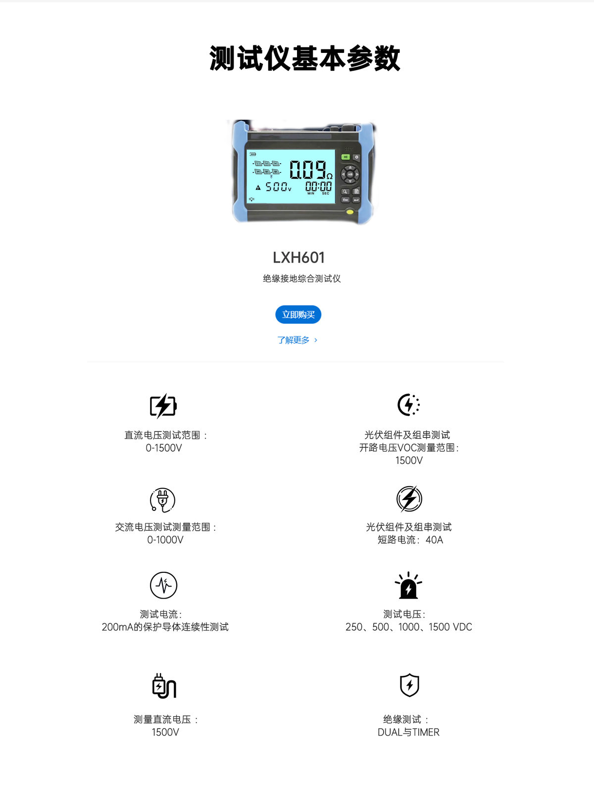 LX-H601絕緣電阻綜合測試儀應用于光伏電站系統的電氣安全測試與高壓電力設備的絕緣測試,整機涵蓋電壓電流測試、連續性接地測試、極性測試、Voc、Lsc、絕緣測試、絕緣故障定位、接地測試等。