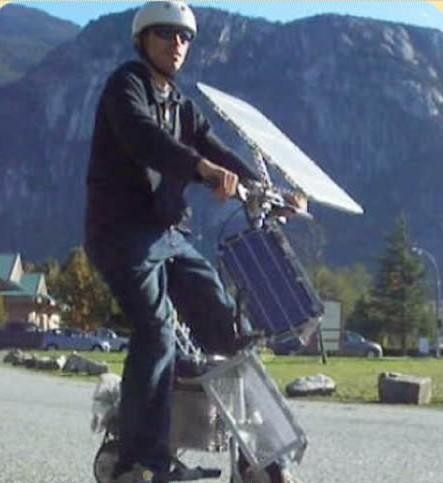 于是他不得不做出了一些小發(fā)明,那就是你從圖上看到的這種光/電混合動力腳踏車,它的電池既可以使用電能充電,也可以使用太陽能,而且,它還是可折疊的哦。
